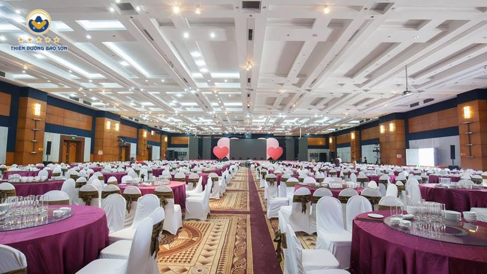 Là thành viên mới trong hệ sinh thái của tập đoàn Bảo Sơn, Baoson Palace nổi bật với sức chứa đến 2000 khách. Toàn bộ hội trường không bị vướng cột lớn, che khuất tầm nhìn kết hợp với trần cao, vách gỗ cùng ánh đèn vàng ấm áp tạo cảm giác ấm cúng, phù hợp với những bữa tiệc sang trọng cuối năm.